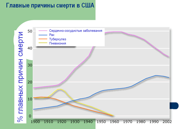Как мы видим, сердечная недостаточность являлась основной причиной смертности последние 26 лет. В России, как и во всем мире, прогрессируют хронические заболевания. И на протяжении последних 50 лет основная причина этого –неправильный образ жизни и неправильное питание.