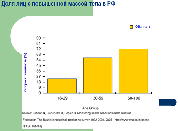 Последний фактор риска – ожирение. Темпы ожирения растут в России. По данным ВОЗ сейчас около 50% людей в ряде возрастных групп в России страдают ожирением. Очевидно, что если мы ничего не предпримем, темпы распространения этих заболеваний будут продолжать возрастать.