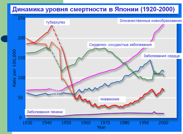 Еще один пример - смертность в Японии. До второй мировой войны основной причиной смерти было такое инфекционное заболевание, как туберкулёз, а сразу с началом массового производства еды с использованием химикатов и многого другого основной причиной смерти становится рак. Рост онкологических заболеваний в Японии продолжается и по сей день.