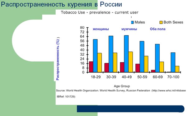 Курение – повышает риск развития ССЗ. Согласно статистике ВОЗ, процент курильщиков в России очень высок, и среди мужчин этот процент значительно выше, чем среди женщин.