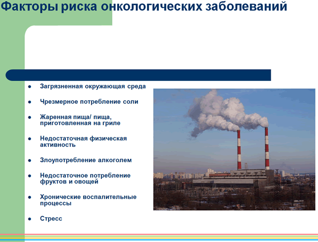 Другими факторами риска являются загрязнение окружающей среды, чрезмерное употребление соли, жареная пища, недостаточная физическая активность, недостаточное количество фруктов и овощей. К примеру, считается, что огромная заболеваемость раком предстательной железы в Японии вызвана избыточным потреблением соли в этой стране. К раку также приводит повышенный уровень воспаления и стресс.