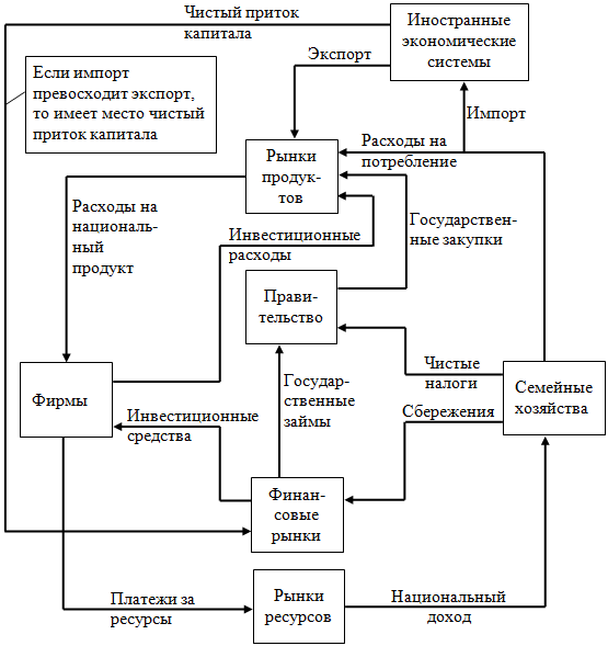 Модель включает сектора: фирмы, правительство, семейные хозяйства, иностранные экономические системы; рынки: продуктов, ресурсов, финансовый; ряд потоков, соединяющих сектора с рынками и между собой, как это указано на схеме. В отличие от рассмотренных выше, представленная модель включает рынки и иностранные экономические системы, что делает ее более адекватной реальной экономической системе.