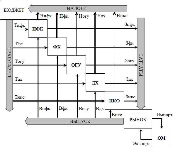 Сектор ОМ соединен с рынком потоками экспорта (Э) и импорта (И), что позволяет осуществлять внешнеэкономическую деятельность. При этом сектор ОМ следует рассматривать как обобщенную экономическую систему со своим секторным делением.