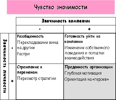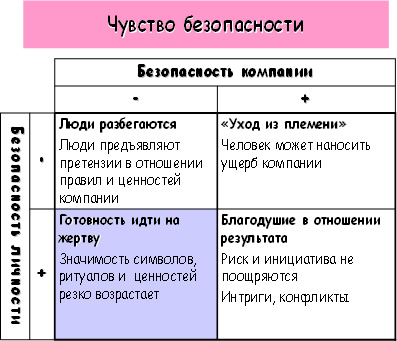 Самые благоприятные сочетания для того, чтобы сотрудники сплачивались, были готовы и желали принять ценности компании — это сочетание высокой безопасности личности и низкой безопасности компании, а также высокой значимости компании и высокой значимости личности.