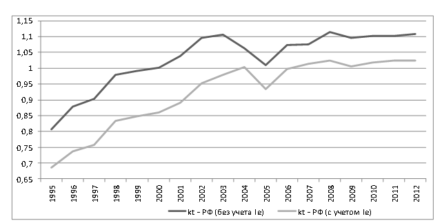В последующем временном интервале (2004-2012 гг.), данный разрыв сокращается до 10-15%%, что можно рассматривать как определенные позитивные сдвиги в решении задачи повышения эффективности использования ресурсов низкой степени переработки.