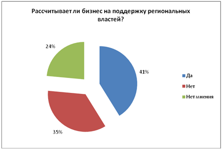 За исключением дотационных регионов, почти все эксперты не рассчитывают на поддержку региональных властей. Основной посыл к ним - не мешайте! Второй момент: государство должно создать условия для защиты собственных производителей, а пока российский бизнес об этих шагах не осведомлен. В целом, российский бизнес готов работать в современных условиях без вмешательства властных структур. По результатам опроса, у бизнесменов нет четкого представления о механизме взаимодействия бизнеса и региональных властей. Единого мнения о том, как власти могут способствовать адаптации бизнеса к новым условиям, тоже нет. В целом, бизнесмены относятся к властным структурам с недоверием.