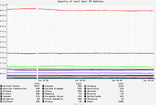 При этом число подключенных к сети bitcoin-клиентов, мягко говоря, совсем невелико. Вот, например, статистика по странам за последние сутки. Судя по этому графику, наибольшее число компьютеров, на которых запущен bitcoin-клиент, зарегистрировано в США, на втором месте – Германия, на третьем Россия.