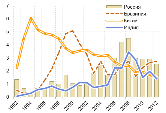 Во-первых, это бремя накопленной за период роста нефтяных цен инфляции и, связанная с этим относительная дороговизна российских товаров в валютном выражении. В сфере инвестиций это проявляется в заметно более низкой, чем у 16 лидирующих стран-конкурентов, доходности проектов, связанных с притоком ПИИ, что следует из соответствующего рейтинга стран, построенного авторами WorldInvestment Report-2013. Например, «нефтяному» Казахстану Россия по этому показателю проигрывает в два раза (13% против 26%), а Нигерии – почти в три раза.