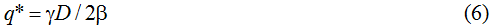 В-третьих, рост налогов понижает производственную асимптоту, что эквивалентно факту сокращения потенциального спроса на инновационном рынке. Геометрически это означает, что асимптота-прямая под воздействием растущих налогов дрейфует вниз вплоть до приятия отрицательного значения, что означает полное разрушение инновационного рынка (предприятия). Таким образом, слишком высокие налоги могут полностью «раздавить» формирующийся сегмент инновационного рынка. Фискальная нагрузка q**, при которой U=0 и инновационный рынок «захлопывается» определяется по формуле: