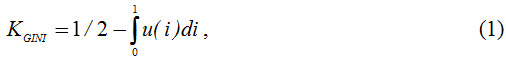 В настоящее время основным инструментом измерения уровня неравенства доходов по социальным группам служит так называемый коэффициент Джини, характеризующий степень искривления кривой Лоренца. Теоретически он вычисляется следующим образом:
