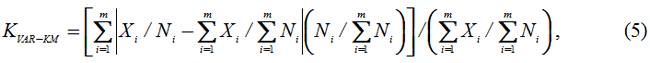 Индикаторы (2)-(4) являются хорошо проверенным инструментарием по оценке неравенства доходов применительно к различным социальным (доходным) группам. Однако все они плохо приспособлены к оценке аналогичных эффектов применительно к регионам страны, для которых само построение кривой Лоренца не имеет прозрачного смысла. В этой связи в аналитической практике используются другие показатели неравномерности развития территорий и регионов. Среди них можно назвать коэффициент вариации Клоцвога-Магомедова, который исчисляется по следующей формуле [2, с.85]: