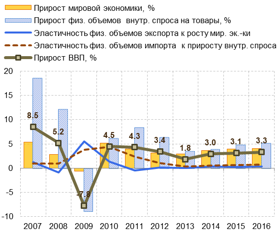 Если сопоставить относительное значение макропоказателей в прогнозе страны, то можно увидеть, что Минэкономразвития закладывает практически двукратное снижение эластичности прироста импорта к приросту внутреннего спроса, ориентируясь, видимо, на выбивающиеся из общего показатели 2013 года, когда импорт, по данным официальной статистики, почти не растет в физическом выражении. Однако чтобы рассматривать наблюдаемый сейчас процесс замедления прироста импорта не как флуктуацию, а как устойчивый тренд, необходимо видеть сопутствующие индикаторы роста общей конкурентоспособности российской продукции. Но этого не обнаруживается, в том числе при анализе данных по экспорту, в частности, эластичности российского экспорта к приросту мировой экономики, косвенно характеризующему прирост внешнего спроса. Последний индикатор в 2012–2013 годов находился на уровне около 0,1 п.п. прироста российского экспорта на 1 п.п. прироста мирового спроса. Правда, в прогнозе Минэкономразвития с 2014 года он вдруг вырастает до 0,3 (см. рис. 1),однако увидеть основания для такого роста конкурентоспособности наших товаров на внешних рынках непросто. В мире набирают силу процессы энерго- и ресурсосбережения, растет добыча топлива из альтернативных источников. Значит, оснований для роста российского сырьевого экспорта нет, а для того чтобы со следующего года начался быстрый рост нашего несырьевого экспорта, уже два-три года должен был бы наблюдаться бурный рост инвестиций и создание новых, конкурентоспособных производств, однако этого тоже пока нет. Инвестиции уже почти год как стагнируют. А если предположить, что наш экспорт вырастет не на 1,2%, а на 0,4%, а импорт увеличится не на 2,2%, а инерционно на 4% (то есть окажется на уровне прогнозируемого роста внутреннего спроса со стороны предприятий и домохозяйств), то темпы роста ВВП должны упасть по сравнению с прогнозом Минэкономразвития и Всемирного Банка на 2014 год минимум на 0,4 п.п. Зафиксируем эту цифру и пойдем дальше.