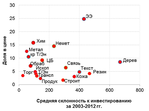 Рис. 2. Соотношение склонности к инвестированию из прибыли в 2003–2012 гг. и доли затрат на продукцию естественных монополий в цене (выпуске) в первом полугодии 2013 г., в %