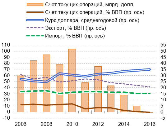 Рис. 3. Динамика показателей внешней торговли и курса рубля в новом среднесрочном прогнозе Минэкономразвития
