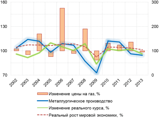 Наши расчеты показывают, что темпы роста мировой экономики объясняют более 60% всех изменений в динамике производства металлургической продукции в мире. Еще большая зависимость от внешнего рынка получается, если рассматривать не темпы роста этих показателей, а их отношение: если рост мировой экономики ускоряется, то при прочих равных это с высокой вероятностью может привести и к ускоренному росту в металлургии (почти 90% корреляции). Поскольку европейская экономика, хотя и очень медленно, но устойчиво начала расти после кризиса и процесса бюджетной консолидации, мы также не ожидаем существенного снижения объемов экспорта в Европу.