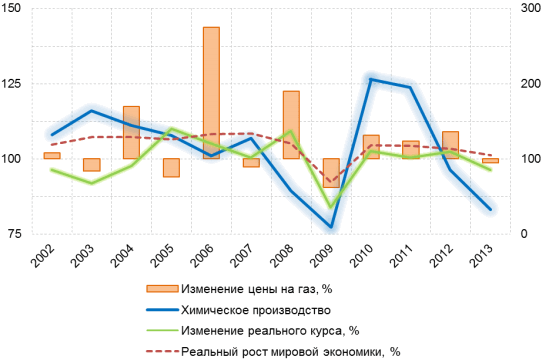 Производство основной химической продукции, удобрений и азотных соединений, пластмасс и синтетического каучука в первичных формах составляет почти 80% всего производства химических веществ и химической продукции. Основным сырьем для производства минеральных удобрений является природный газ. Согласно экспертным оценкам, химическая отрасль Украины потребляет 8–8,5 млрд м3 природного газа в год, а в силу высокой себестоимости (старое оборудование) доля Украины на мировом рынке удобрений потихоньку снижается.
