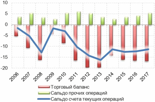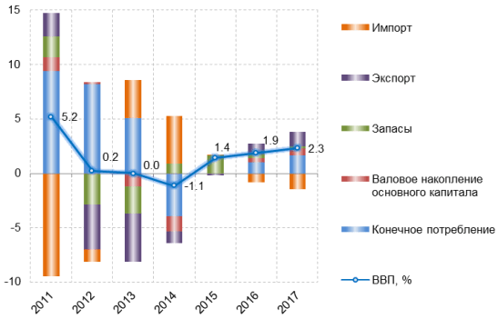 В 2016–2017 годах экономический рост ускорится до 1,9 и 2,3% соответственно. При этом положительный вклад фактора запасов значительно сократится (в среднем до 0,4% в год). Однако внутренняя обстановка будет все больше стабилизироваться, а проводимые властями реформы начнут давать свои плоды. Начнет расти потребление населения (+1,0 и +1,6% к приросту ВВП в 2016 и 2017 году соответственно), чему также будет способствовать снижение инфляции до 4–5%. Рост инвестиций будет прибавлять к приросту ВВП 0,4–0,6%, проникающий в страны ЕС экспорт – еще 0,9–1,4%. При этом из-за девальвации несколько снизится склонность к импортированию с 0,8 в среднем в 2007–2012 годах до 0,6–0,7 в 2014–2017 годах.