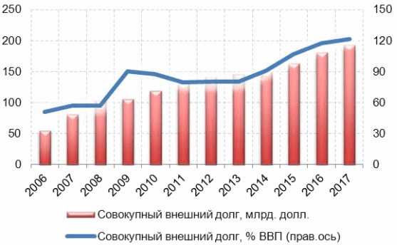 Внешний долг частного сектора сейчас превышает 100 млрд долл. Снижение инвестиционных рейтингов Украины, геополитические риски и, как следствие, ухудшение внешних условий заимствований приведут к тому, что ставки для предприятий и банков на внешнем рынке окажутся неподъемными и новые займы частного сектора за рубежом в 2014 году не смогут даже обеспечить рефинансирование его внешнего долга. В последующие годы помощь мирового сообщества, снижающая инвестиционные риски, особенно на фоне стабилизации экономики и ее последующего роста, может стать фактором возобновления притока частного капитала. Но это приведет к дальнейшему наращиванию внешнего долга. Внешняя долговая нагрузка частного сектора увеличивается до 80% в 2017 году (по сравнению с 40% в 2006 году, 68% в 2009 году после девальвации гривны и 60% в 2013 году перед ее очередной девальвацией).