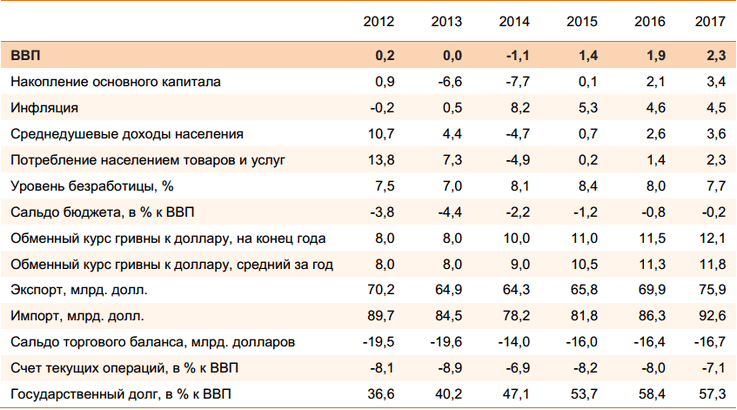 В 2015 году начнется восстановительный рост экономики (+1,4% за год), но только за счет фактора запасов, распродажа которых прекратится. Данный фактор внесет положительный вклад в прирост ВВП в размере 1,6%. Влияние остальных компонент ВВП будет незначительным. Так, инвестиции в основной капитал в 2015 году будут демонстрировать нейтральную динамику вследствие, во-первых, нерастущего спроса на отечественную продукцию и, во-вторых, трудностей с привлечением капитала (напряженность в украинской банковской системе, недоверие иностранных инвесторов к украинской экономике). Экспорт также не будет расти из-за недостаточного спроса на украинскую продукцию. Слабая динамика потребления населения будет наблюдаться вследствие высокой инфляции, медленного роста экономики и низких темпов индексации зарплат, бюджетных и социальных выплат.