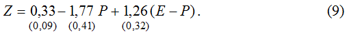 В отличие от предыдущих построений в качестве относительного показателя налоговой задолженности отрасли нами использовалась доля задолженности по налогам, включая задолженность во внебюджетные фонды, в добавленной стоимости промышленности (Z). Вычислительные эксперименты показали, что рассмотрение единого показателя экспортной активности промышленности в части минеральных ресурсов неэффективно для наших целей. В этой связи весь поток экспортируемых минеральных продуктов нами был разделен на две группы с соответствующими показателями: Е – доля всего экспорта минеральных продуктов, включая сырую нефть, в добавленной стоимости промышленности; Р – доля экспорта сырой нефти в добавленной стоимости промышленности; Е–Р – доля экспорта ненефтяных (прочих) минеральных продуктов в добавленной стоимости промышленности. Ретроспективный период анализа – 1995-2002 гг.