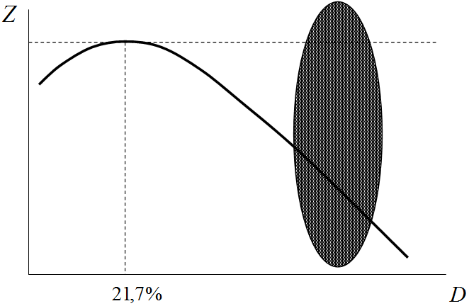 Теперь несколько слов о точке максимума D*=21,7%. На наш взгляд, данная величина должна трактоваться как верхняя граница естественного уровня убыточности российской экономики. Превышение этой границы приводит в действие «эффект вытеснения». Однако на левой стороне параболы (3) данный эффект полностью подавляется и в дело вступают более естественные экономические механизмы. Так, в этой зоне рост доли убыточных предприятий приводит к невозможности получить с них налоги в полной мере, в связи с чем растет задолженность по налогам. Можно сказать, что преодоление точки