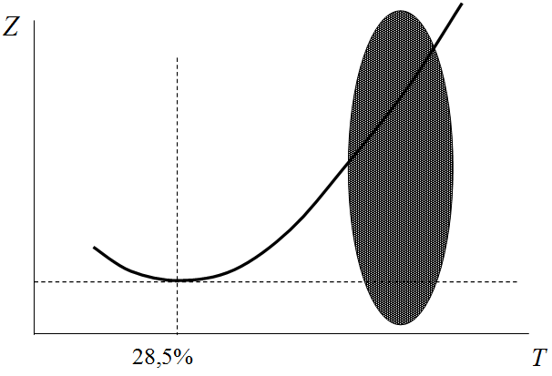 Более тщательное исследование свойств зависимости (4) показывает, что она представляет собой параболу относительно величины номинальной фискальной нагрузки T, ветви которой направлены вверх. Точка минимума при этом принимает значение Т*=28,5%. Из данных табл.2 хорошо видно, что все фактические значения номинального налогового бремени существенно превышают критическое значение Т*=28,5%. Графически искомая зависимость может быть представлена на рис.2, где область с темной заливкой обозначает место скопления эмпирических значений номинальной фискальной нагрузки.
