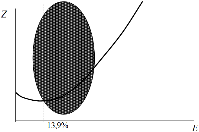 Как и модель (4), зависимость (5) представляет собой параболу, ветви которой направлены вверх. Соответственно стационарная точка представляет собой точку минимума и имеет значение E*=13,9%. Однако в данном случае налицо и явное отличие от предыдущих зависимостей. Дело в том, что фактические значения доли Е не отстоят в отдалении от стационарной точки, как это было в зависимостях (3) и (4), а наоборот группируются вокруг нее. Схематично этот процесс показан на рис.3 (как и раньше темной заливкой показана область скопления эмпирических значений Е). Данный факт является принципиальным для нашего анализа. Раскроем данный тезис более подробно.