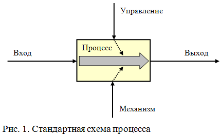 Стандартный процесс по методологии IDEF0, определяется как: преобразование "входа" в "выход", под действием "управления" с ис-пользованием "механизма". Графическая нотация процесса в системе моделирования [15] представлена на рис. 1.