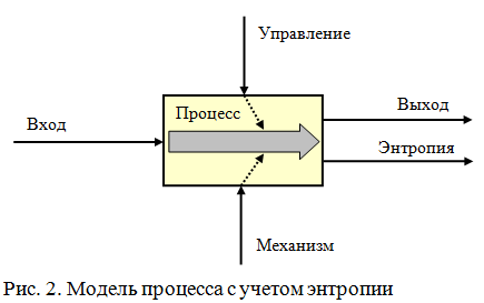 Особенностью процессного подхода является возможность декомпозиции – разбиения основного процесса на составляющие подпроцессы. Система может описываться одним или некоторой совокупностью процессов. Как известно, преобразование входа в выход сопровождается потерями, которые присутствуют как в самом жизненном цикле, так и в элементах процесса. Потери носят разнообразный характер, в современной науке отождествляются с энтропией. Модель процесса с учетом энтропии представлена на рис. 2.