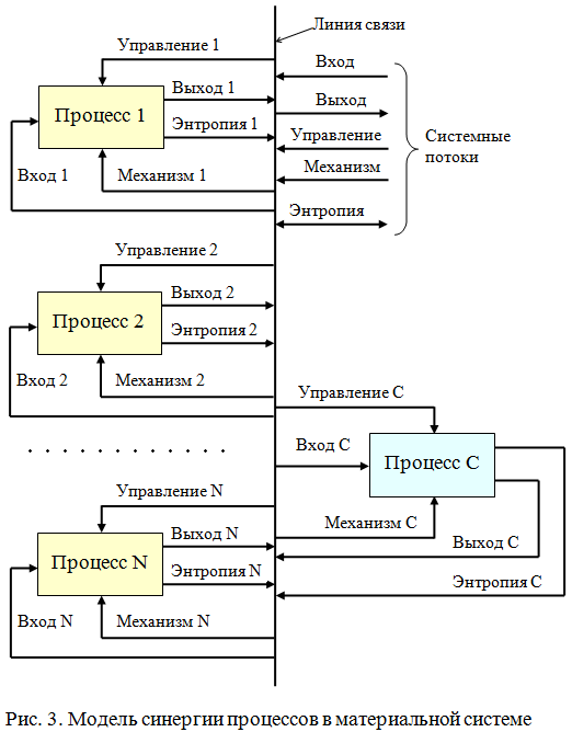 На схеме процесс существования системы (включает совокупность взаимосвязанных процессов 1, …, N) имеет обобщенные элементы: вход, управление, механизм, выход, энтропию, выход С. Энтропия поступает с выхода процесса на его вход, потребляется процессом, формируя дополнительный выход С, отражающий действие синергии в системе.