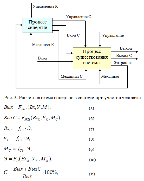 На основании полученных из расчетной схемы обобщенных уравнений имеем возможность определять синергию процессов в самоорганизующихся системах и в системах, организованных человеком. Функции и переменные указанных уравнений подлежат дополнительному исследованию и уточнению в соответствии с характером решаемых задач.