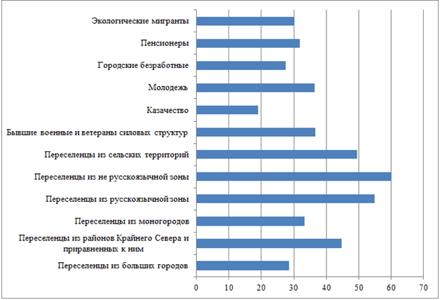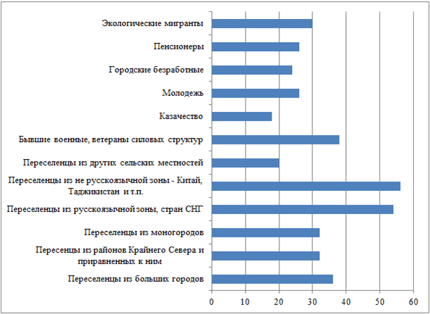 По итогам экспертного опроса были уточнены целевые социальные группы, которые могут послужить донорами для миграции на сельские территории внутри Российской Федерации. К ним относятся: 1) городские безработные, 2) лица раннего пенсионного и предпенсионного возраста, 3) лица, принадлежащие к группам риска по занятости (жители моноэкономических районов, Крайнего Севера, сокращаемые или недавно сокращенные сотрудники силовых структур, выпускники вузов по маловостребованным профессиям), 4) недавние (после 1991 года) переселенцы из села в город. Каждая из этих групп способна обеспечить существенный (исчисляемый сотнями тысяч человек) приток населения на сельские территории. Однако в настоящий момент интерес к такой миграции среди всех целевых групп оценивается экспертами как крайне низкий.