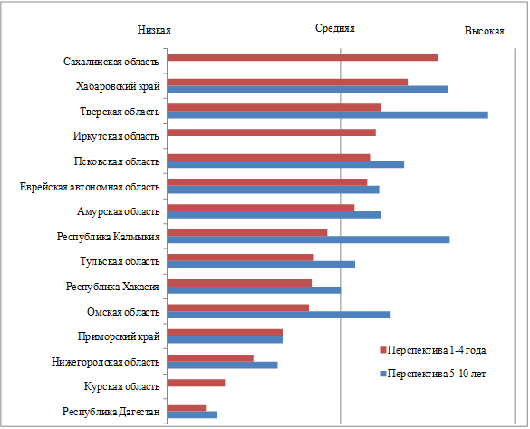 В среднесрочной перспективе Республика Дагестан по-прежнему практически не будет нуждаться в трудовых ресурсах на сельских территориях. В отношении остальных регионов эксперты полагают, что будет присутствовать средняя или высокая потребность в трудовых ресурсах для развития сельского хозяйства. Наиболее острая ситуация нехватки трудовых ресурсов в сельском хозяйстве может сложиться в таких регионах как Тверская область, Республика Калмыкия и Хабаровский край. В некоторых регионах эксперты затруднились оценить ситуацию на перспективу в 5-10 лет, поэтому данные по этим регионам отсутствуют.