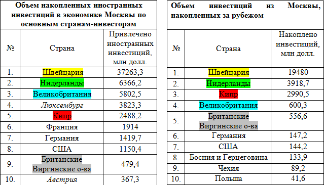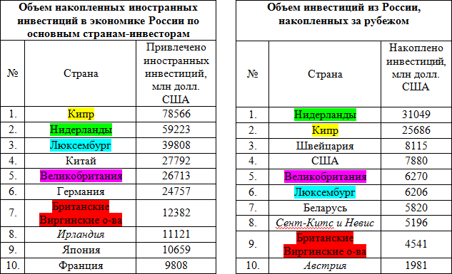Вывод денег из страны – не всегда безвозвратное бегство капитала за рубеж и совсем необязательно – оптимизация налогообложения при помощи оффшоров. Если ознакомиться с данными Росстата по объему инвестиций из России, накопленных за рубежом за прошлый год, то крупнейшими получателями инвестиций являются Нидерланды, Кипр, Швейцария, США, Великобритания, Люксембург, Беларусь, Сент-Китс и Невис, Британские Виргинские острова и Австрия. Вместе с тем крупнейшими инвесторами России в 2012 году были Кипр, Нидерланды, Люксембург, Китай, Великобритания, Германия, Британские Виргинские острова, Ирландия, Япония и Франция. Как видим, во многом это одни и те же страны, в том числе и оффшорные юрисдикции.