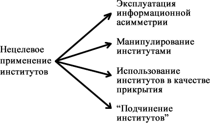 В рамках первого типа злоупотребления институтами (эксплуатация информационной асимметрии) неразборчивые в средствах экономические агенты делают вид, что следуют правилам использования институтов, но на самом деле нарушают эти правила к собственной выгоде, пользуясь тем, что такие нарушения остаются безнаказанными. Во втором случае институты используются для оправдания деятельности, которая формально соответствует "букве" институтов, но никоим образом не отвечает их духу и замыслу. В третьем варианте институт используется для того, чтобы скрывать в его "тени" неблаговидную и, возможно, противозаконную деятельность. Наконец, в ситуации четвертого типа институт оказывается "захваченным" определенной группой интересов, которая превращает его из общественного блага в эксклюзивный источник рентыiv.