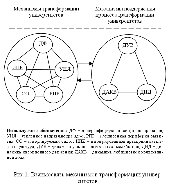 Динамика усиливающегося взаимодействия (ДУВ). Рассмотренные выше пять механизмов трансформации редко действуют каждый по себе. Как правило, они «работают» одновременно, поддерживая и усиливая друг друга. Таким образом, постоянное сопряжение всех механизмов порождает мощный синергетический эффект. Например, усиленная управленческая способность активизирует поиск дохода, развитие мультидисциплинарной деятельности по оказанию разнообразных услуг, формирования уважительного отношения к предпринимательскому поведению в научных департаментах и реализацию претензий на наличие особой культуры. Но и сам управленческий аппарат постепенно меняется: новые инициативы, новые группы и новые пересекающиеся взаимоотношения приводят к пересмотру распределения полномочий и ответственности. Начинается поиск нового баланса между центральными группами администрирования и факультетами; продолжающееся расширение периферии развития, возможное благодаря диверсификации дохода и распределения полномочий, превращает университет в организационный гибрид, ставя под сомнение главенство отделений. Подобное новое единое целое, состоящее из многих вновь возникших институционализированных элементов, препятствует возвращению старого порядка и не позволяет скатиться к былым традициям [1, с.155]. В этом и состоит первый принцип поддержания изменений: элементы трансформации становятся элементами устойчивого развития лишь тогда, когда они объединяются и порождают эффект синергии.