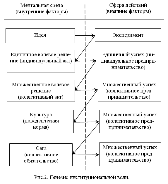 На первом этапе возникает новая организационная идея, которая должна быть осуществимой. На самом деле часто возникает даже не одна, а множество идей, некоторые из них связаны между собой, некоторые являются конкурирующими; большая часть этих идей отсевается еще до стадии системной реализации или после того. На втором этапе, как правило, происходит проверка идеи путем экспериментирования с ней. Если результат оказывается положительным и идея является все-таки реализуемой, то осуществляется третий этап, на котором принимается единичное волевое решение о системном осуществлении изменений. На этом этапе подобные решения являются прерогативой избранных, немногочисленных участников университетской жизни. На четвертом этапе первопроходцы воплощают принятое решение в жизнь и добиваются индивидуального успеха. Успех окрыляет не только тех, кто имеет к нему непосредственное отношение, но и тех, кто работает рядом и наблюдает за развитием событий. В результате такого восприятия успеха на пятом этапе формируется благоприятный эмоциональный климат, порождающий множественное волевое решение о системном осуществлении изменений, что инициирует массовое предпринимательство. На этом этапе плодотворная идея окончательно и по-настоящему овладевает массами, что позволяет принимать коллегиальное согласованное решение об изменениях, приводя на шестом этапе к множественному успеху, когда многие подразделения университета удачно включаются в коллективное предпринимательство. Если успех сопутствует университетскому коллективу достаточно долгое время, то он закрепляет новые подходы к управлению, превращая их на седьмом этапе в институциональную норму и делая их элементом культуры вуза с соответствующей предпринимательской атмосферой. На восьмом этапе сложившаяся культура уже сама инициирует новые ростки коллективного предпринимательства, превращая инновационные изменения в устойчивый процесс. Накопление достаточно солидной истории успеха вопреки всем препятствиям и даже козням со стороны враждебных сил позволяет немного приукрасить события и тем самым на девятом этапе сформировать сагу, т.е. стилизованное и одухотворенное сказание об инновационном стиле университета. Сага становится важным элементом университетского бренда, основой его высокой репутации, выражением его имиджа и престижа. В свою очередь сага, став воплощением культуры университета, формирует некую духовную и ментальную среду, которая не только способствует коллективному предпринимательству, но и делает его на десятом этапе практически безальтернативной моделью поведения; теперь это уже фактически коллективное обязательство. Так поэтапно складывается ПУ. Схематично это показано на рис.2, где нами подчеркнуто перманентное двусторонне сопряжение ментальной и практической сфер.