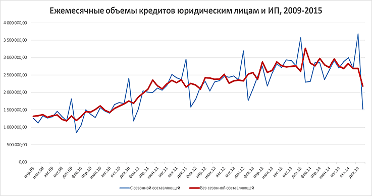 В январе 2015 года впервые за последние пять лет после глобального финансово-экономического кризиса в сфере кредитования юридических лиц и индивидуальных предпринимателей наблюдается серьезное замедление. Объемы выдаваемых кредитов опустились до февральских объемов 2011 года и составили 1 530 000 млн руб. Учитывая предшествующую положительную динамику в этих видах кредита, такой результат на январь 2015 года говорит о существенной реакции рынка на ужесточение денежно-кредитной политики в декабре 2014 года.