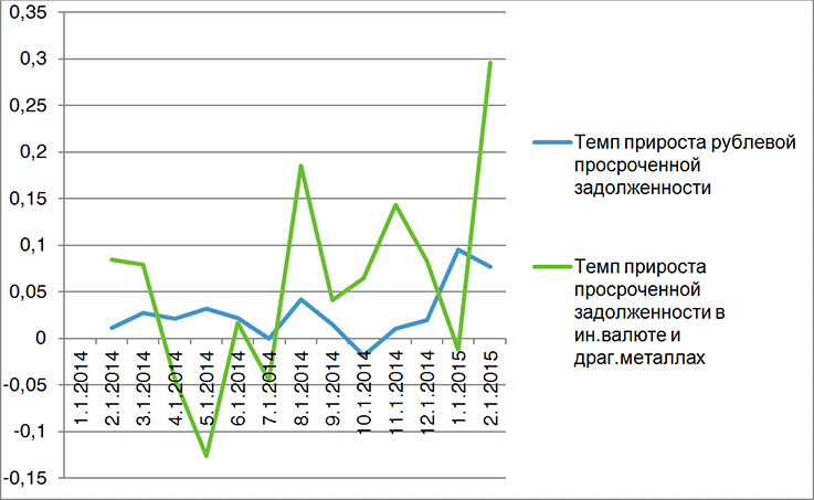 График 2 Темп прироста просроченной задолженности в рублях и в иностранной валюте, драгоценных металлах, в период 2014 - 2015 гг.