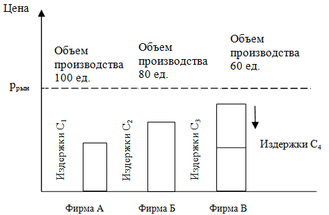 Предположим, что на рынке имеется три Компании: Компания А, Компания Б и Компания В. Они имеют различную цену на свою продукцию и издержки производства Предположим, что уровень цен на товары равен Ррын. (см. рис. 1).