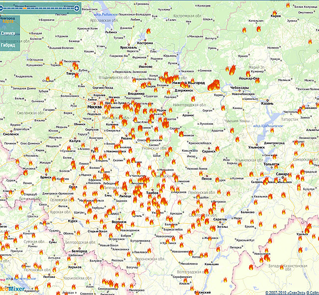 Очаги пожаров, детектированные по данным MODIS 21-28 июля 2010 г. Данные сервиса «Пожары—Космоснимки»