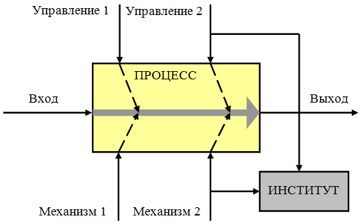 Модель работает следующим образом. На "вход" процесса поступает исходная величина (объект, состояние, параметр), которая преобразуется в "выход" в соответствии с внутренними процедурами (операциями) процесса, а также при помощи внешнего "управления" и с использованием "механизмов". В модели может быть несколько элементов управления и несколько механизмов. Особенностью представленной модели является то, что элементы процесса "управление 2" и "механизм 2" взаимосвязаны между собой логически и образуют новый элемент процесса – институт. Институт в модели является неотъемлемой частью процесса, так как сформирован из его элементов.