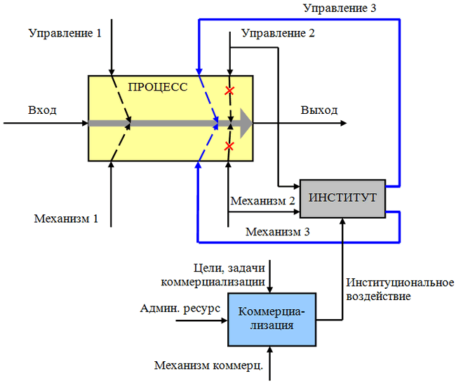 4) Применение новых механизмов и вспомогательных процессов регулирования коммерциализации институтов. Как показывает опыт бизнес - моделирования, коммерциализация дает максимальную результативность применительно к результатам процесса, его выходу (стрелка, выходящая из блока). Например, проведена НИР, результатом которой стала разработка материалов с новыми свойствами. Коммерциализация результатов данной НИР представляет собой создание условий, при которых новые свойства полученных материалов при использовании в других процессах (например, в промышленности) дадут экономический эффект. То есть мы получаем каскад процессов, в котором коммерциализация выхода первого процесса усиливает входы последующих. Коммерциализация других элементов процесса (стрелок, входящих в блок) ведет к дополнительным трансакционным издержкам, а значит, к снижению общей эффективности процесса. В результате коммерциализация институтов как интегрированных структур элементов управления и механизма с точки зрения процессного подхода заведомо должна приводить к снижению их эффективности.