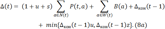 Кроме этого, в кредитную массу включается остаток предыдущего периода Δкон(t-1) с учётом процентов. Если остаток был положителен, то в течение периода он использовался в качестве внешних инвестиций, если отрицателен, то для его покрытия был использован внешний заём, а значит, на него начислены проценты по займу. Считаем, что заем берется на один период, так что в конце периода он возвращается за счет имеющихся средств или нового займа. Для удобства записи введем обозначения Δкон+(t-1) = max{0,Δкон(t-1)}, Δкон-(t-1) = min{0,Δкон(t-1)}. Тогда в кредитную массу добавляется