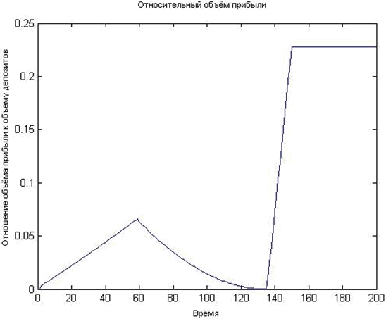 В результате расчётов получаем, что максимальная допустимая ставка равна 1,8%. Удобно рассматривать относительный объём прибыли, то есть отношение прибыли к объему депозитов в данный момент времени. График относительного объёма прибыли за период изображен на рис. 2.
