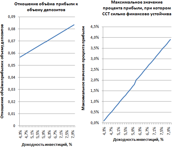 Напомним, что в базовом примере срок кредита равен 150% от срока вклада. Увеличение срока кредита приводит к уменьшению прибыли. Граница сильной финансовой устойчивости достигается при отношении срока кредитования к сроку накопления), равном 1.7, а граница финансовой устойчивости - при отношении, равном 5.
