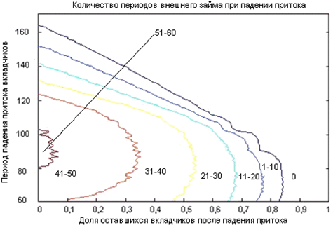 Естественно считать, что t≥60, когда уже есть агенты, выплачивающие кредит. На рис.7 представлены линии уровня, соответствующие числам периодов внешнего займа 0;10; 20;30;40;50. Как видно, небольшое падение доли вкладчиков (до 0,17 от начального количества) не влияет на сильную финансовую устойчивость независимо от момента шока. При более значительном падение всё зависит от того, в какой период времени оно происходит. Если момент шока достаточно удален от начала функционирования системы, то падение притока слабо влияет на количество периодов внешнего займа (уже выдано достаточно кредитов, чтобы поддерживать систему). При выбранных параметрах самый плохой сценарий развивается при падении притока в 89-й период. К этому моменту уже выдано много кредитов, кредитная масса не очень велика, а функция F(t) ещё отрицательная, поэтому изменение притока вкладчиков неблагоприятным образом влияет на устойчивость ССТ.