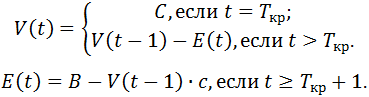 Tкр + 1 ≤ t ≤ Tкр + τкр (то есть, в момент t агент находится в состоянии выплат по кредиту). Через V(t,a) обозначим оставшийся объём тела кредита, а через E(t,a) - выплаты по телу кредита в момент времени t.