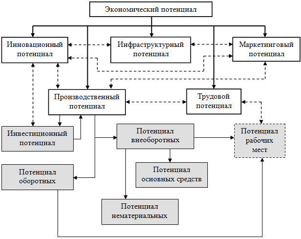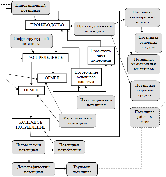 Производственный потенциал входит в состав экономического потенциала. Он функционально связан с трудовым, инновационным и маркетинговым потенциалами. На системном уровне именно производственный потенциал формирует рабочие места, которые выступают в качестве функциональной обратной связи для трудового потенциала. В результате происходит сбалансированное перераспределение потоков и запасов в системе; потенциалы структурируются. Определение весов составляющих экономического потенциала в структуре является важной задачей научного исследования, так как дает возможность определять состояние системы и делать объективные прогнозы.