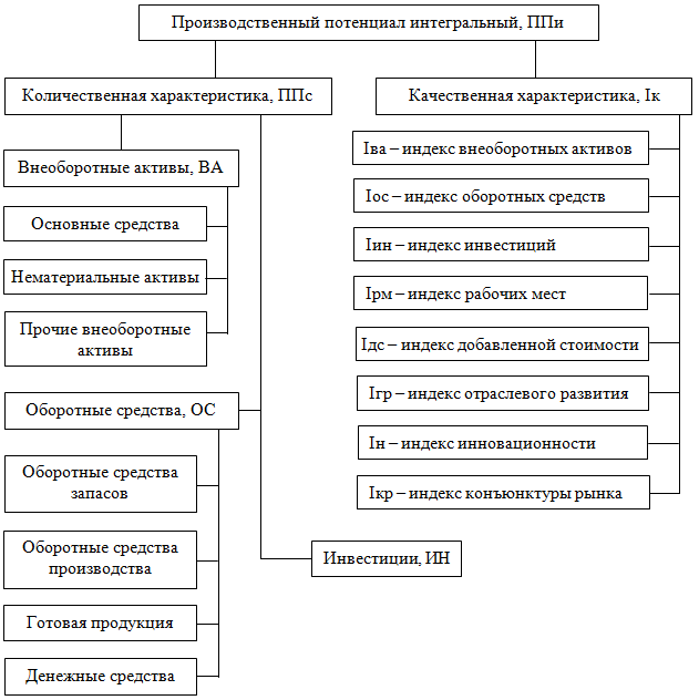 Производственный потенциал включает в себя, помимо перечисленных количественных характеристик, дополнительные качественные характеристики (индексы), в том числе: индекс внеоборотных активов, индекс оборотных средств, индекс инвестиций, индекс рабочих мест, индекс добавленной стоимости, индекс отраслевого развития, индекс инновационности и индекс конъюнктуры рынка. Перечисленные индексы отражают "запас качества" производственного потенциала.